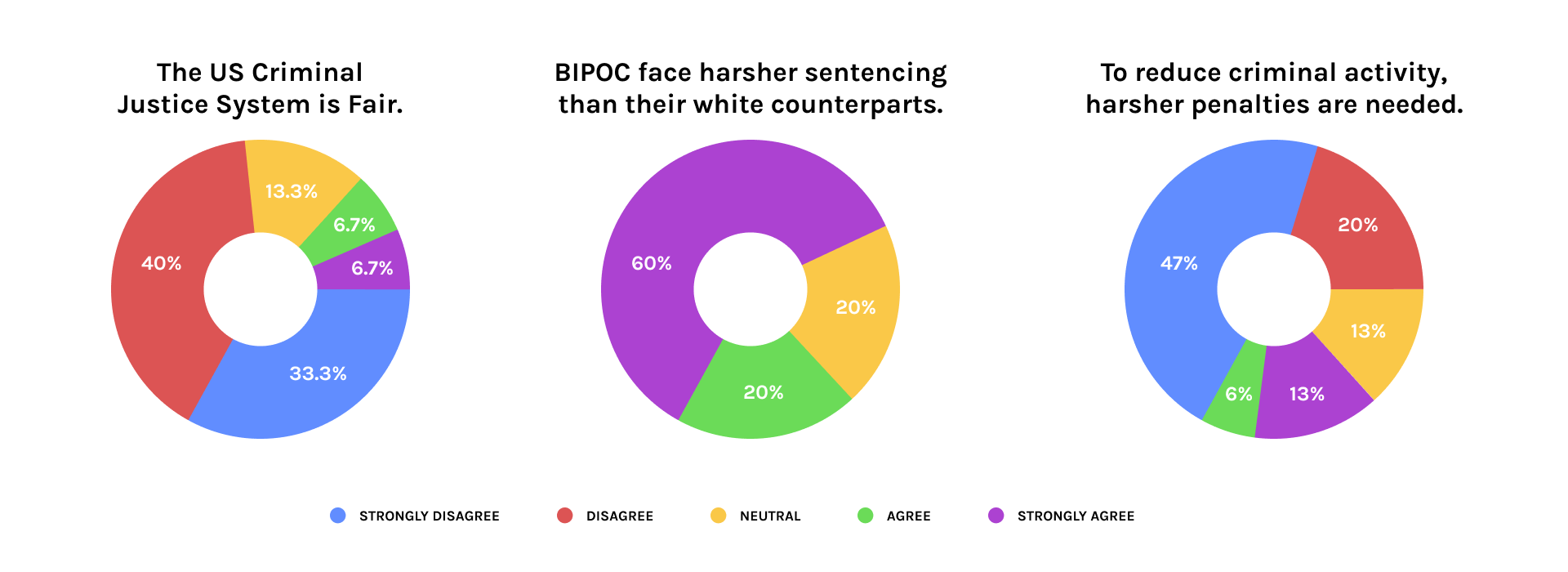 Concurrently with our stakeholder interview we deployed a survey using Google Forms. We gathered a total of 15 responses on a range of qualitative questions about the U.S. Criminal Justice system as well as attitudes on non-profit organizations. One trend we noticed was that a majority of people did not find the current state of the justice system to be fair. There was also strong agreement that black, indigenous and people of color faced harsher sentences and treatment than their white counterparts.