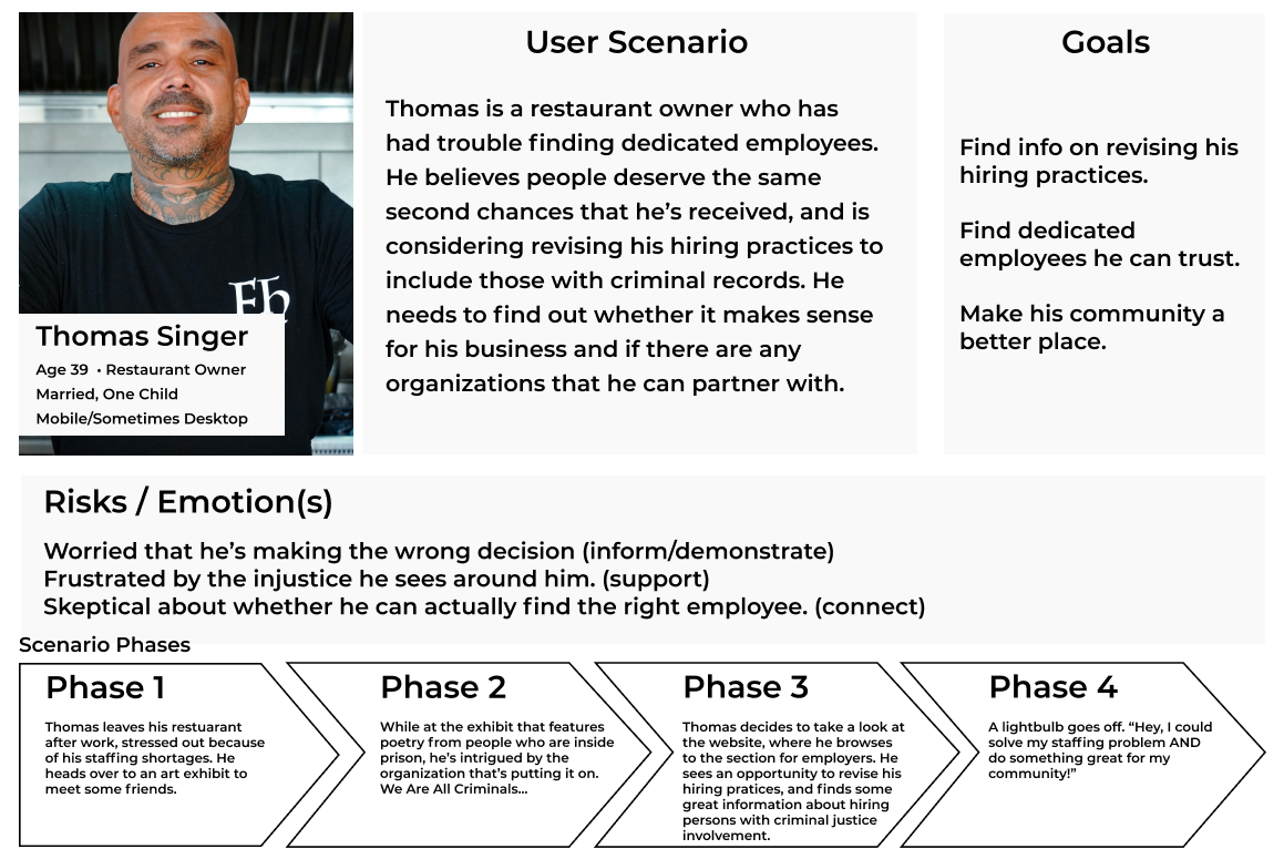Meet Thomas Singer, a restaurant owner who's having difficulty finding dedicated employees. Due to his need to find employees, he's at a point where he's willing to consider revamping some of his hiring practices to allow individuals with criminal records to work for him. Thomas is an accurate representation of the segment of users we were going to target with our redesign.